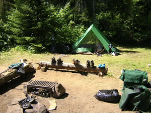 Travel early for best campsite selection doing it in the dark is no fun. Setting up camp on islands helps reduce your chances of bear problems and usually provide a breeze to keep mosquitoes away. Look for level tent sites away from the fire pit, a tarp under your tent should keep you dry, don't let excess go more than a couple of inches past tent though. Be aware of down trees and exposed roots in the immediate area that could blow down or conduct electricity in a storm. Also a lightning storm is no time to start hanging tarps, keep an eye on the weather and be prepared A clean, organized camp helps prevent bear problems and lost equipment. Delegating duties works best with everyone responsible for some chores. Cook on a low fire to avoid burning food, most freeze dried food just requires a boiling water, so it is all done at the same time. Rub a light layer of dish soap on outside of pots and soot will wipe off. Clean dishes and hang food before dark. Remember, no food in the tents unless would like bears in your dreams. Also, fish remains can be put on rocks for gulls, bury if you have no takers. Dead firewood can be found along shorelines away from campsite. White birchbark from dead trees can be peeled and will light wet or dry. Keep fires small and contained and be extra careful with axes, saws and fillet knives.